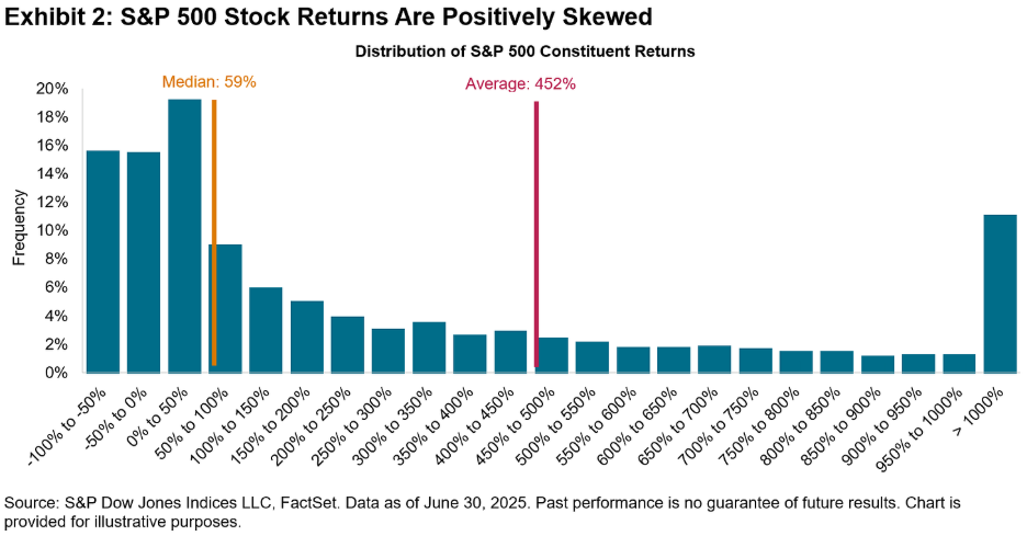 Statistical evidence backs up why this is such a poor strategy. According to S&P Dow Jones Indices, from the beginning of 2001 through September 2025, only 19% of S&P 500 stocks outperformed the average stock’s return. In the first half of 2025 alone, just 44% of S&P 500 members beat the index; in 2024, that number dropped to 28%. In fact, most S&P stocks lagged the index in 13 of the past 24 years. If you’re lucky enough to pick a market-beating stock, your gains can be substantial,returns are positively skewed, with enormous upside potential, while your maximum loss is capped at 100%. It doesn’t take a genius to see how important it is to let your winners run.